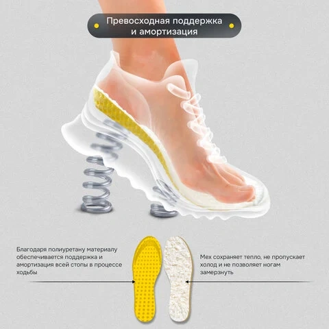 Основа стелек выполнена из инновационного материала EVA (ЭВА), который имеет уникальную структуру микропор, наполненных воздухом, обладает водонепроницаемостью и высокими теплоизоляционными свойствами. Основа из EVA не пропускает холод до -40 °C, сохраняет тепло. Покрытие из искусственной шерсти также сохраняет тепло, не позволяя стопе замерзнуть.