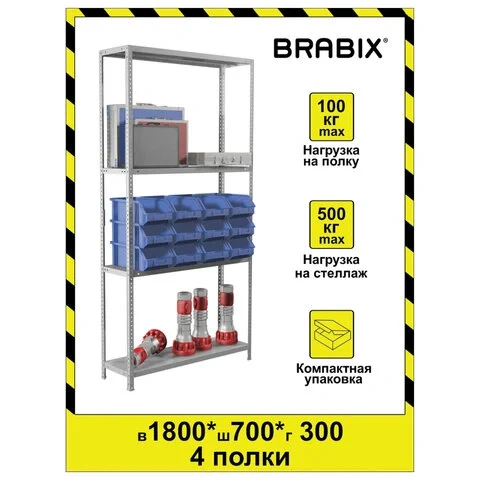 Стеллаж металлический Brabix MS KD-185/30/70-4 1850х700х300мм, 4 полки