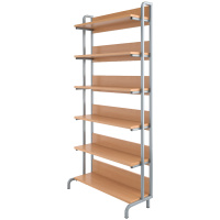 Полки и доборы стеллажа выполнены из ЛДСП 16мм, торцы деталей закрыты противоударной кромкой ПВХ. Металлический каркас выполнен из профиля квадратного сечения 25х25 и 20х20 мм с толщиной стенок не менее 1,2мм и покрыт порошковой краской, стойкой к химическим и механическим воздействиям. На свободных концах труб установлены заглушки из ударопрочных полимеров. Каркас стеллажа имеет полимерные подпятники, предотвращающие повреждение напольного покрытия.