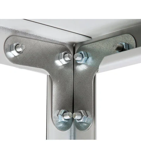 Для повышения жесткости всей конструкции - верхняя и нижняя полка усилена дополнительными Г-образными уголками.