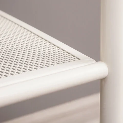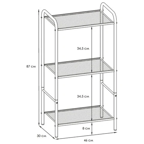 Стеллаж выполнен из прочной металлической трубы 16 мм и стального листа в мелкую сетку.