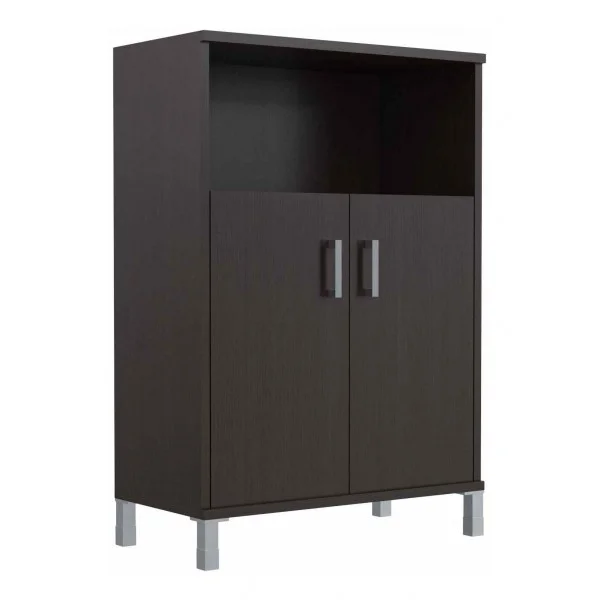 Универсальный средний шкаф BORN для офисного или домашнего использования. Размеры - 900х1286х450 мм, цвет – Венге Магия. Оснащен 3 просторными полочками, 2 нижние закрываются дверцами из ЛДСП, а верхняя - открытая. На дверцах установлены стильные металлические ручки. Шкаф имеет опоры увеличенной длины. Конструкция оснащена прочными силовыми креплениями – эксцентриковыми стяжками. Все торцы основных элементов шкафа надежно защищены кромкой ПВХ – 2 мм. Регулируемые по высоте опоры обеспечат шкафу устойчивость на неровном полу.