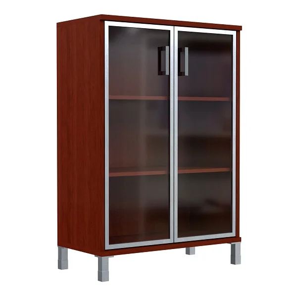 Широкий средний шкаф BORN для офисного или домашнего использования. Размеры - 900х1286х450 мм, цвет - Бургунди. Двустворчатый шкаф оснащенный 3 просторными полочками, которые закрываются стеклянными дверцами с металлической рамкой по краям. На дверцах установлены стильные металлические ручки. Конструкция оснащена прочными силовыми креплениями – эксцентриковыми стяжками. Все торцы основных элементов надежно защищены кромкой ПВХ – 2 мм. Регулируемые по высоте опоры обеспечат шкафу устойчивость на неровном полу.