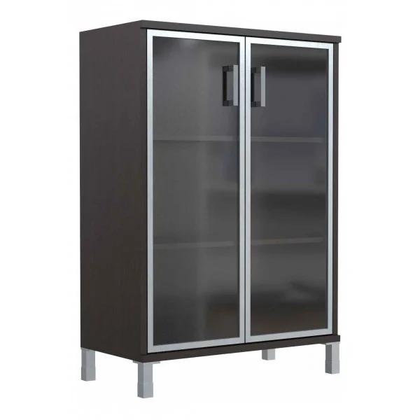 Широкий средний шкаф BORN для офисного или домашнего использования. Размеры - 900х1286х450 мм, цвет - Венге Магия. Двустворчатый шкаф оснащен 3 просторными полочками, которые закрываются стеклянными дверцами с металлической рамкой по краям. На дверцах установлены стильные металлические ручки. Конструкция оснащена прочными силовыми креплениями – эксцентриковыми стяжками. Все торцы основных элементов надежно защищены кромкой ПВХ – 2 мм. Регулируемые по высоте опоры обеспечат шкафу устойчивость на неровном полу.
