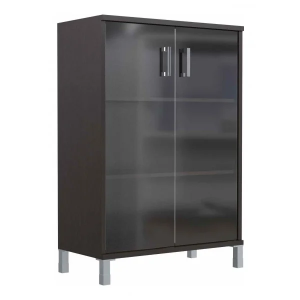 Широкий средний шкаф BORN для офисного или домашнего использования. Размеры - 900х1286х450 мм, цвет - Венге Магия. Двустворчатый шкаф оснащен 3 просторными полочками, которые закрываются стеклянными дверцами. На дверцах установлены стильные металлические ручки. Конструкция оснащена прочными силовыми креплениями – эксцентриковыми стяжками. Все торцы основных элементов надежно защищены кромкой ПВХ – 2 мм. Регулируемые по высоте опоры обеспечат шкафу устойчивость на неровном полу.