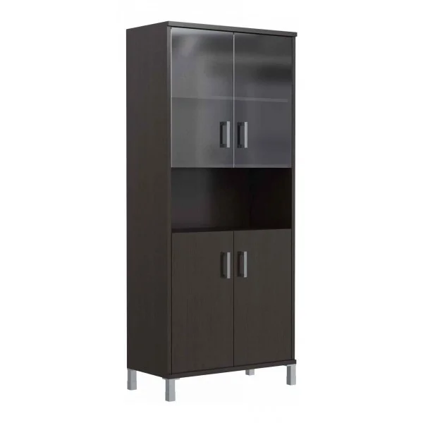 Универсальный комбинированный шкаф BORN для офисного или домашнего использования. Размеры - 900х2054х450 мм, цвет – Венге Магия. Оснащен 5 просторными полочками, 2 нижние закрываются дверцами из ЛДСП, 2 верхние – стеклянными, а посередине одна открытая полочка. На дверцах установлены стильные металлические ручки. Шкаф имеет опоры увеличенной длины. Конструкция оснащена прочными силовыми креплениями – эксцентриковыми стяжками. Все торцы основных элементов шкафа надежно защищены кромкой ПВХ – 2 мм. Регулируемые по высоте опоры обеспечат шкафу устойчивость на неровном полу.
