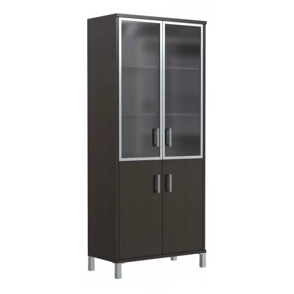Широкий комбинированный шкаф BORN для офисного или домашнего использования. Размеры - 900х2054х450 мм, цвет - Венге Магия. Шкаф имеет опоры увеличенной длины. Двустворчатый шкаф оснащен 5 просторными полками, две нижние закрыты дверцами из ЛДСП под цвет конструкции, три верхние – стеклянными дверцами с металлической рамкой по краям. На всех дверцах установлены стильные металлические ручки. Конструкция шкафа оснащена прочными силовыми креплениями – эксцентриковыми стяжками. Все торцы основных элементов шкафа надежно защищены кромкой ПВХ – 2 мм. Регулируемые по высоте опоры обеспечат шкафу устойчивость на неровном полу.