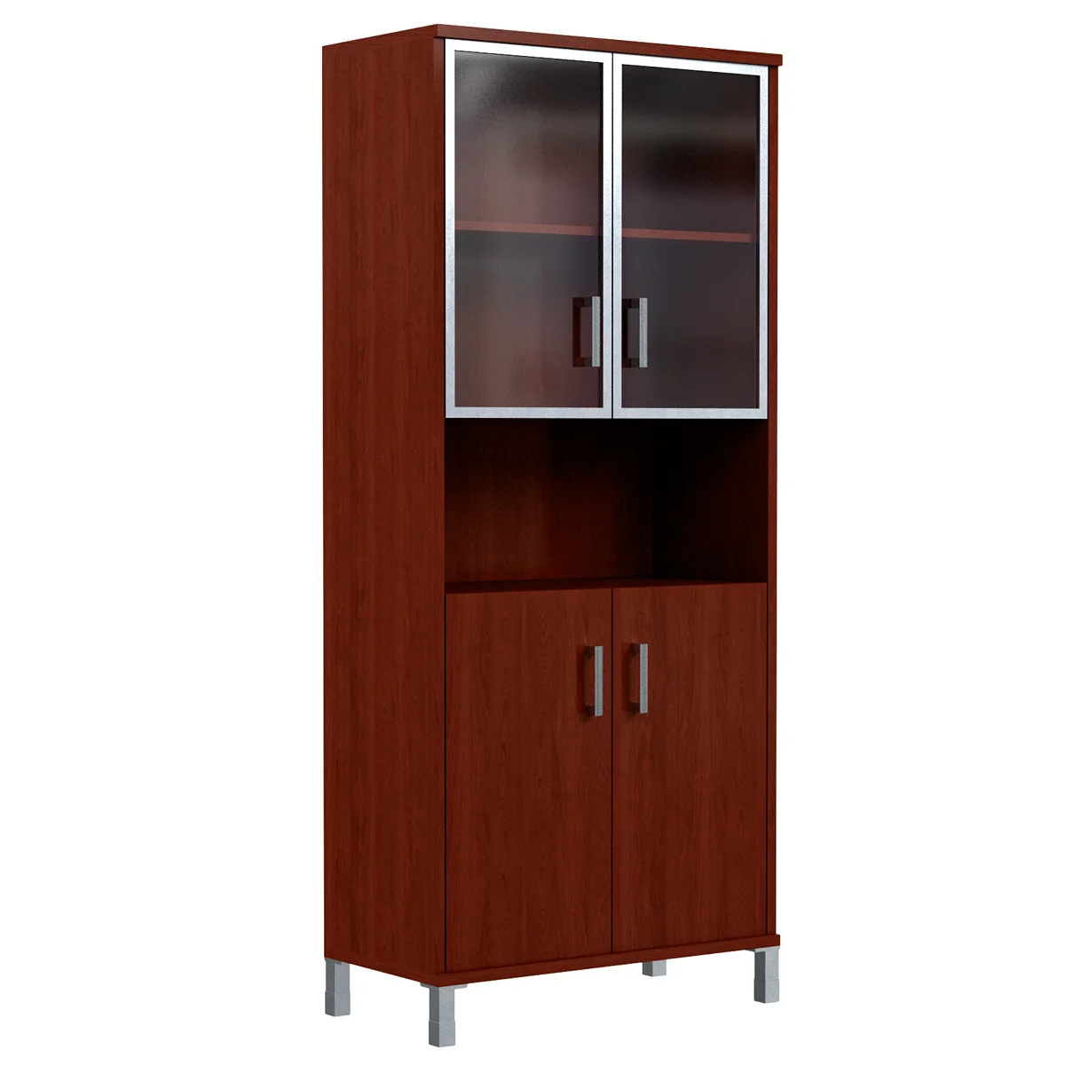 Универсальный комбинированный шкаф BORN для офисного или домашнего использования. Размеры - 900х2054х450 мм, цвет – Бургунди. Оснащен 5 просторными полочками, 2 нижние закрываются дверцами из ЛДСП, 2 верхние – стеклянными дверцами с металлической рамкой, а посередине одна открытая полочка. На дверцах установлены стильные металлические ручки. Шкаф имеет опоры увеличенной длины. Конструкция оснащена прочными силовыми креплениями – эксцентриковыми стяжками. Все торцы основных элементов шкафа надежно защищены кромкой ПВХ – 2 мм. Регулируемые по высоте опоры обеспечат шкафу устойчивость на неровном полу.