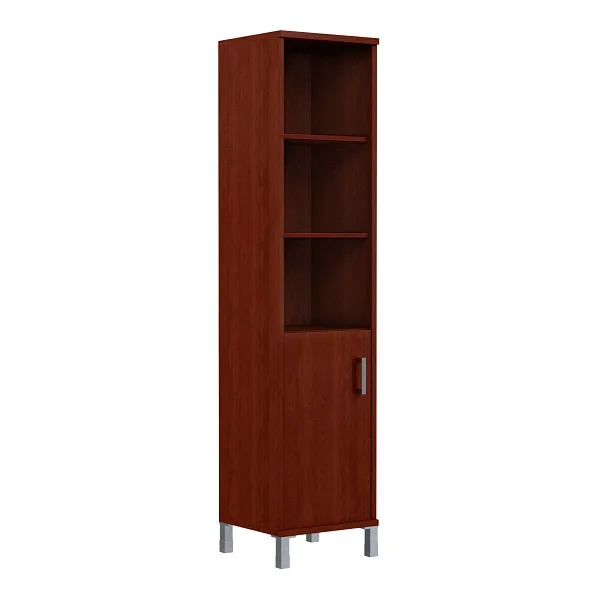 Универсальный шкаф-стеллаж BORN для офисного или домашнего использования. Размеры - 475х2054х450 мм, тип – левосторонний, цвет - Бургунди. Шкаф оснащен 5 полками, две нижние закрыты дверцей из ЛДСП под цвет конструкции, три верхние – открытые. На дверце установлена стильная металлическая ручка. Конструкция шкафа оснащена прочными силовыми креплениями – эксцентриковыми стяжками. Все торцы основных элементов шкафа надежно защищены кромкой ПВХ – 2 мм. Регулируемые по высоте опоры обеспечат шкафу устойчивость на неровном полу.