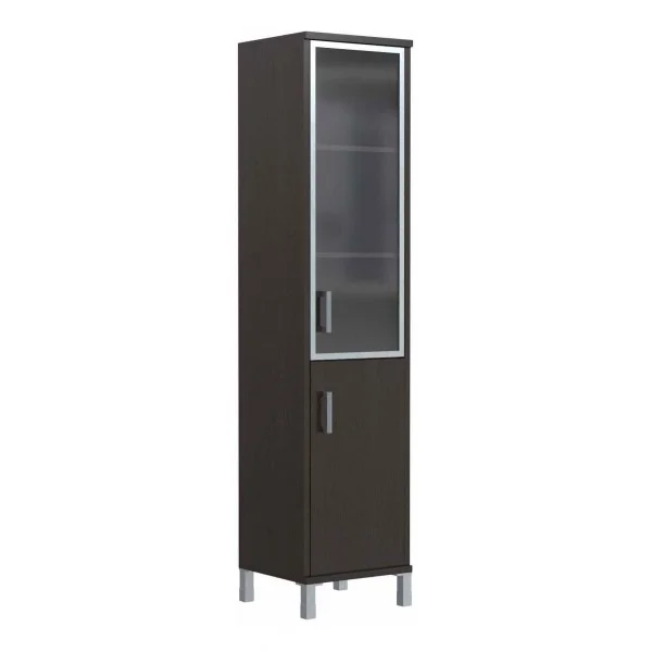 Универсальный комбинированный шкаф BORN для офисного или домашнего использования. Размеры - 475х2054х450 мм, тип – правосторонний, цвет - Венге Магия. Шкаф имеет опоры увеличенной длины. Оснащен 5 полками, две нижние закрыты дверцей из ЛДСП под цвет конструкции, три верхние – стеклянной дверцей с металлической рамкой по краям. На дверцах установлены стильные металлические ручки. Конструкция шкафа оснащена прочными силовыми креплениями – эксцентриковыми стяжками. Все торцы основных элементов шкафа надежно защищены кромкой ПВХ – 2 мм. Регулируемые по высоте опоры обеспечат шкафу устойчивость на неровном полу.