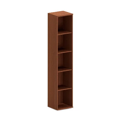 Узкий и высокий стеллаж IMAGO предназначен для использования в офисных или домашних условиях. Размеры изделия составляют 406х1975х365 мм, цвет – Орех Французский. Стеллаж оснащен пятью просторными и открытыми полками.