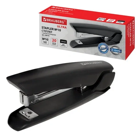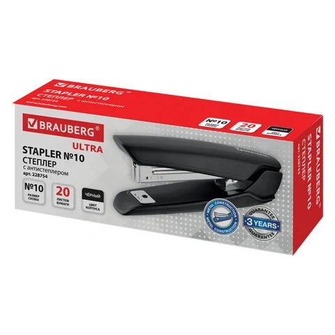 Степлер №10 BRAUBERG 'ULTRA', до 20 листов, с антистеплером, черный, 228754