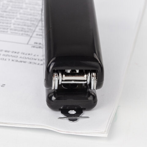 Степлер с антистеплером в черном пластиковом корпусе с металлическим механизмом cпособен скрепить до 12 листов. Подходящий размер скоб - № 10. Виды сшивания: закрытый, прямой. Глубина закладки бумаги - 64 мм. Габариты: высота - 45 мм, ширина - 25 мм, длина - 110 мм. Благодаря компактным размерам удобен в использовании и занимает мало места на рабочем столе, а классический дизайн делает степлер подходящим к любому интерьеру. Продается в картонной упаковке.