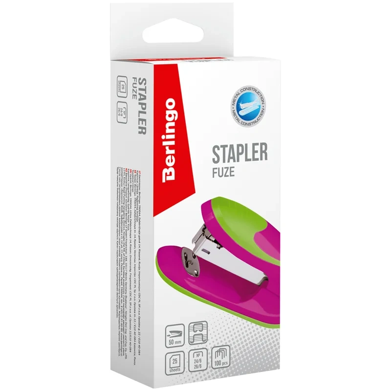 Степлер №24/6, 26/6 Berlingo 'Fuze' до 25л., 100 скоб, пластиковый корпус, розовый