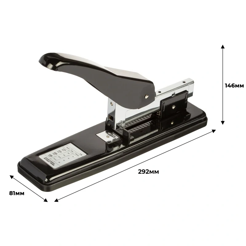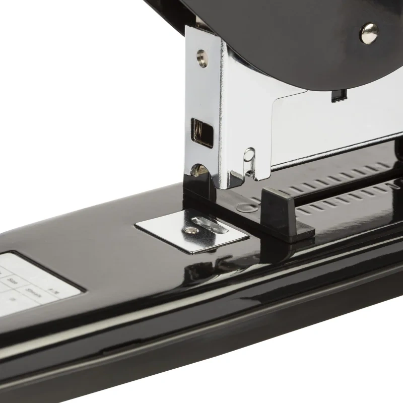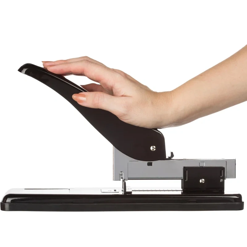 Для эффективного сшивания максимально допустимого объема бумаги необходимо расположить степлер на горизонтальной твердой поверхности, прикладывая усилия, плавно надавить на рычаг (при необходимости двумя руками), разномерно распределяя усилия по поверхности рычага.
