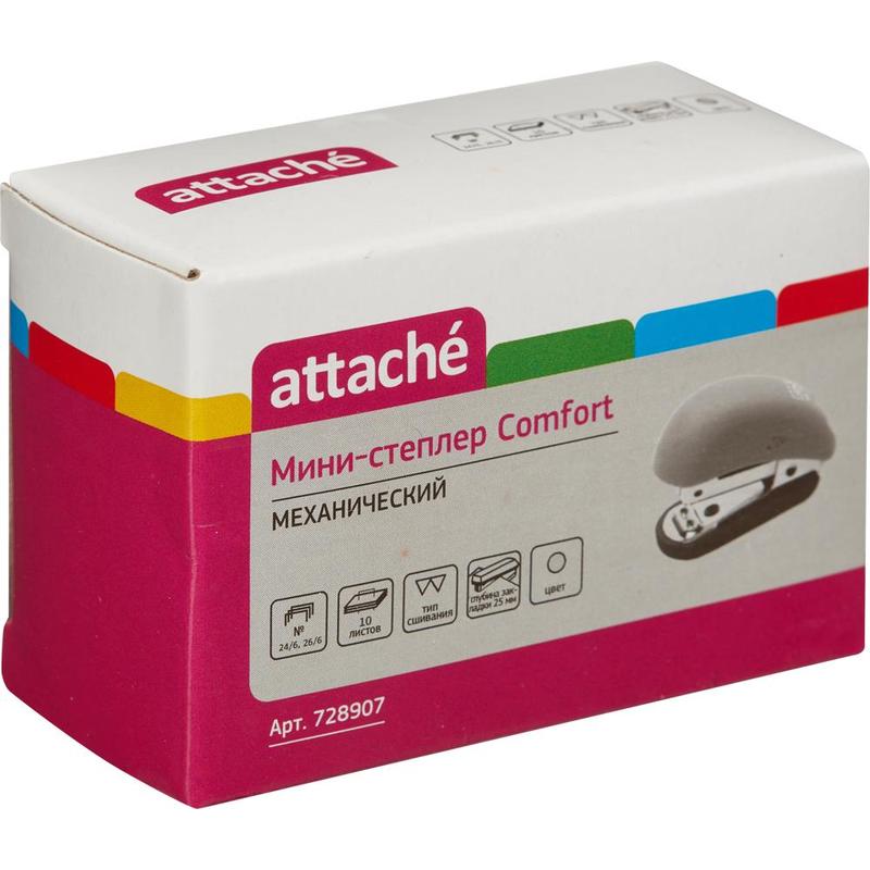 Степлер Attache Comfort одновременно сшивает до 15 листов плотностью 70 г/кв.м. Позволяет производить сшивание закрытым способом. Глубина закладки бумаги — 25 мм. Корпус выполнен из пластика черно-серого цвета. В степлере используются скобы N24/6 вместительностью 40 штук и 26/6 вместительностью 50 штук.