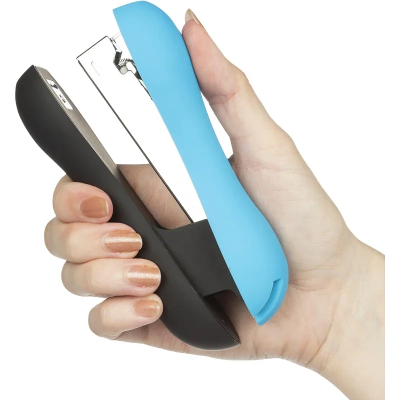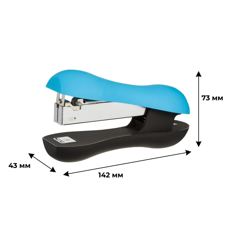 Степлер вертикальный Attache Comfort один из самых важных помощников для работы с документацией в офисе, образовательных учреждениях и дома. Настольный степлер выполнен в пластиковом корпусе черного и голубого цвета. Корпус имеет мягкое покрытие Soft Touch, что делает комфортным сшивание при длительной работе. Рабочие компоненты изготовлены из высококачественной стали. Степлер Attache Comfort одновременно сшивает до 20 листов бумаги плотностью до 80 г/кв.м. Степлер скрепляет бумагу закрытым типом сшивания, при котором ножки скобы загибаются внутрь. Это дает возможность надежно хранить сшитые документы на протяжении длительного времени. Степлер совместим со скобами № 24/6 и 26/6. Глубина закладки бумаги — 65 мм (6,5 см). Вместимость лотка для скоб: 100 скоб размером № 24/6, 150 скоб размером № 26/6. Размер изделия: 142×73×43 мм. Вертикальный степлер Attache Comfort занимает минимум пространства на столе.