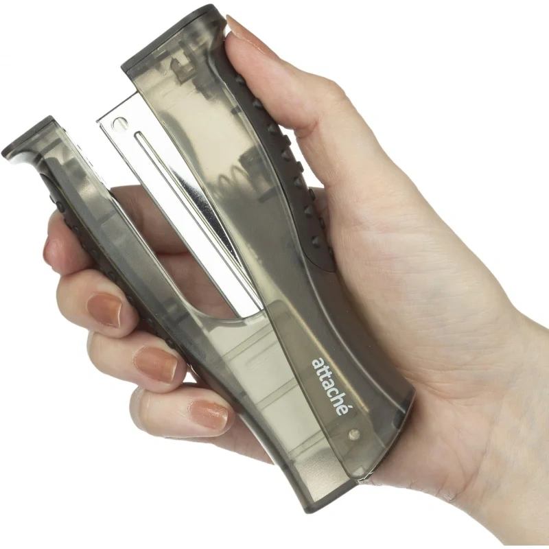 Степлер средний вертикальный Attache 8918 один из важных помощников для работы с документацией в офисе, образовательных учреждениях и дома. Корпус выполнен из полупрозрачного пластика черного цвета. Прорезиненные рельефные вставки черного цвета обеспечивают удобство захвата и предотвращют скольжение. Рабочие компоненты изготовлены из высококачественной стали. Степлер одновременно сшивает до 20 листов бумаги плотностью до 80 г/кв.м. Позволяет производить сшивание открытым и закрытым способом. Степлер совместим со скобами № 24/6 и 26/6. Глубина закладки бумаги — 50 мм (5 см). Вместимость лотка для скоб: 80 скоб размером № 24/6, 100 скоб размером № 26/6. Размер изделия: 131×68×32 мм. Возможно вертикальное расположение.
