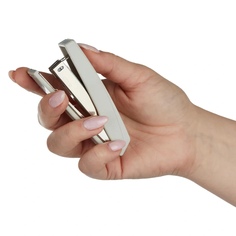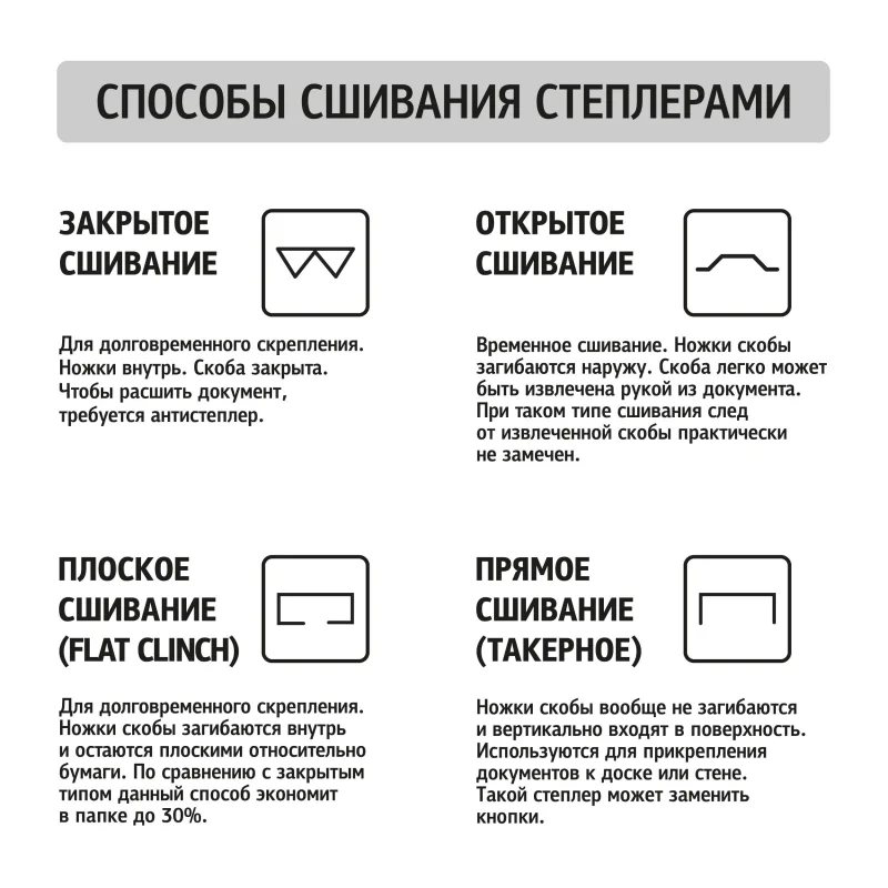 Степлер способен одновременно сшивать до 10 листов бумаги плотностью до 80 г/кв.м. Скрепление осуществляется закрытым типом сшивания, при котором ножки скобы загибаются внутрь, что обеспечивает надежное хранение сшитых документов на длительный срок. Модель оснащена антистеплером и совместима со скобами размера 10. Глубина закладки бумаги составляет 50 мм (5 см). Вместимость лотка для скоб - 50 штук.
