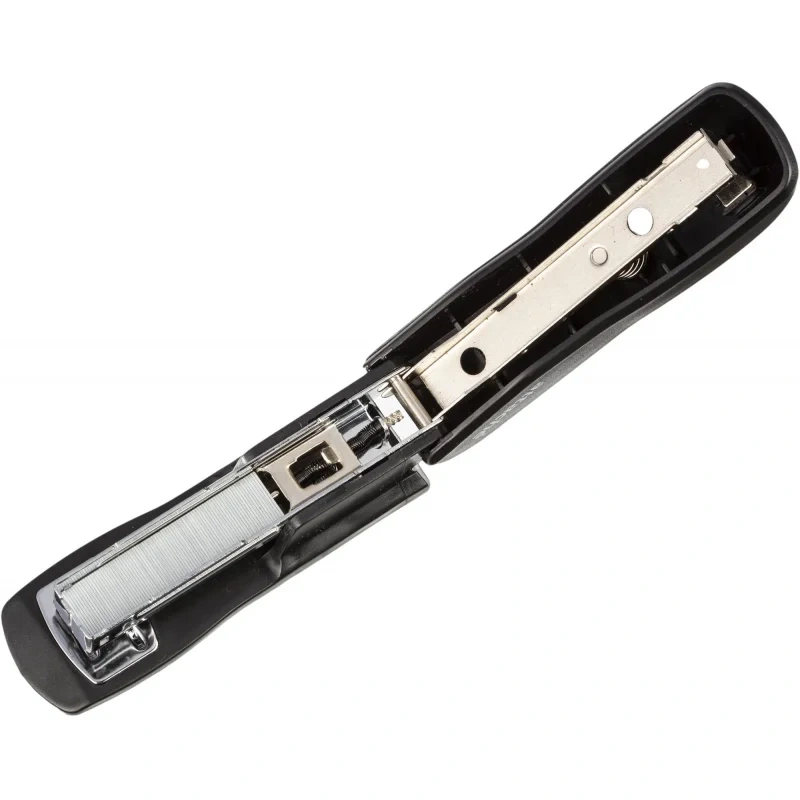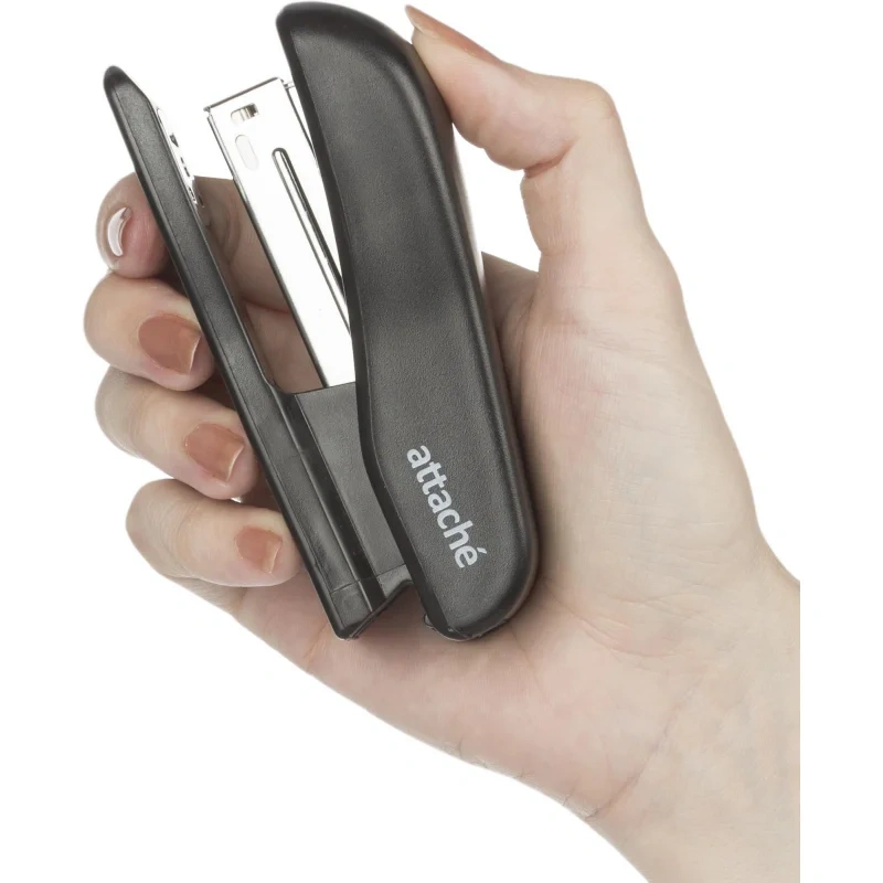 Степлер Attache (Attache Economy) один из самых важных помощников для работы с документацией в офисе, образовательных учреждениях и дома. Настольный степлер выполнен в пластиковом корпусе чёрного цвета и обладает компактными размерами. Степлер Attache Economy одновременно сшивает до 20 листов бумаги плотностью до 80 г/кв.м. Позволяет производить сшивание открытым и закрытым способом. Степлер совместим со скобами 24/6 и 26/6. Глубина закладки бумаги — 45 мм (4.5 см). Вместимость лотка для скоб: 65 скоб размером 24/6, 90 скоб размером 26/6. Размер изделия: 100×38×48 мм. За счёт компактных размеров не займёт на рабочем столе много места, а классический чёрный цвет отлично впишется в любой интерьер. Для эффективного сшивания максимально допустимого объёма бумаги необходимо расположить степлер на горизонтальной твёрдой поверхности, прикладывая усилия, плавно надавить на рычаг (при необходимости двумя руками), разномерно распределяя усилия по поверхности рычага.