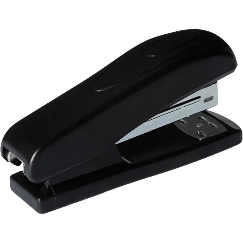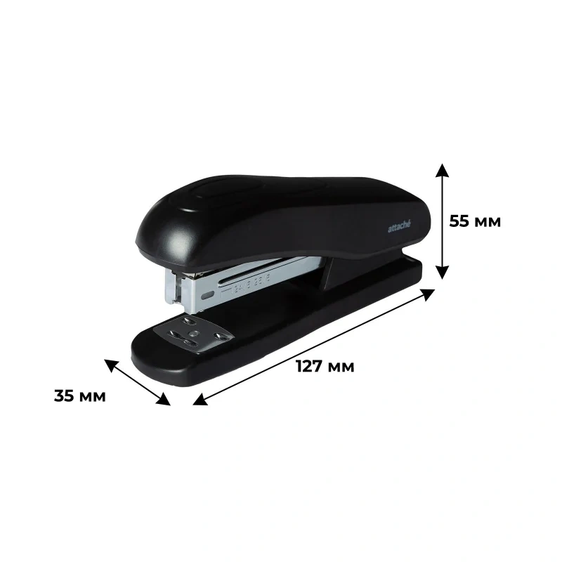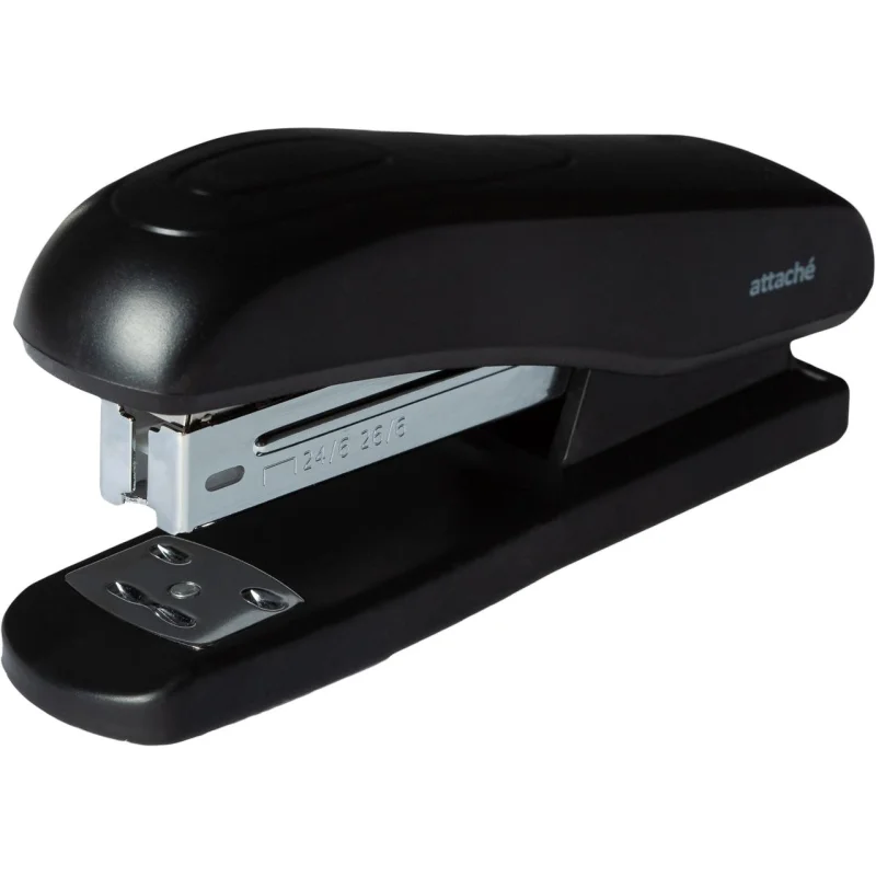 Степлер Attache (Attache Economy) один из самых важных помощников для работы с документацией в офисе, образовательных учреждениях и дома. Настольный степлер выполнен в пластиковом корпусе чёрного цвета и обладает средними размерами. Степлер Attache Economy одновременно сшивает до 25 листов бумаги плотностью до 80 г/кв.м. Позволяет производить сшивание открытым и закрытым способом. Степлер совместим со скобами 24/6 и 26/6. Глубина закладки бумаги — 60 мм (6 см).Вместимость лотка для скоб: 50 скоб размером 24/6, 100 скоб размером 26/6. Размер изделия: 127×35×55 мм. Для эффективного сшивания максимально допустимого объёма бумаги необходимо расположить степлер на горизонтальной твёрдой поверхности, прикладывая усилия, плавно надавить на рычаг (при необходимости двумя руками), разномерно распределяя усилия по поверхности рычага.