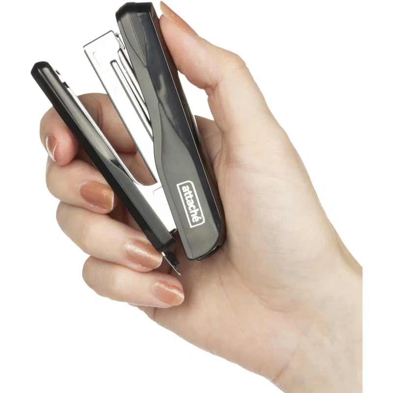 Степлер Attache выполнен в корпусе из высококачественного пластика черного цвета и оснащен металлической базой. Рабочие компоненты изготовлены из высококачественной стали. Степлер совместим со скобами № 24/6-26/6, одновременно сшивая до 20 листов бумаги плотностью до 80 г/кв.м. Модель оснащена антистеплером, механизмом быстрой загрузки скоб и индикатором наполненности лотка для скоб, что делает ее очень удобной в применении. Степлер сшивает как закрытым, так и прямым типом сшивания. Закрытый тип сшивания, при котором ножки скобы загибаются внутрь, дает возможность надежно хранить сшитые документы на протяжении длительного времени. Прямой тип сшивания, при котором ножки скобы не загибаются, позволяет прикреплять объявления или документы к мягкой поверхности, например к пробковой доске. Для этого достаточно раскрыть степлер на 180 градусов и закрепить документ. Вместимость лотка для скоб: 50 скоб размером № 10. Глубина закладки бумаги: 50 мм.