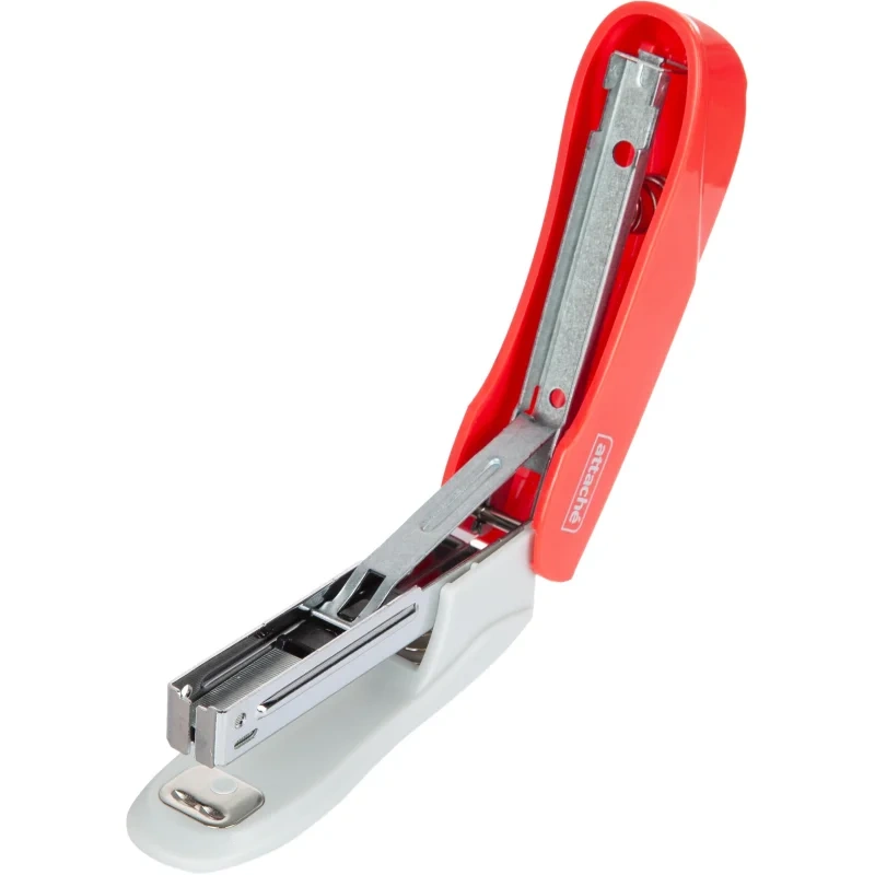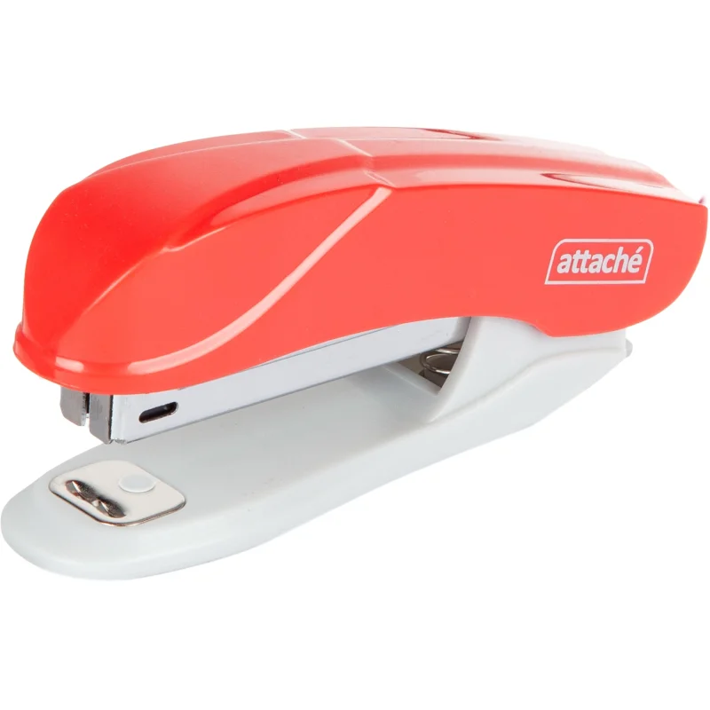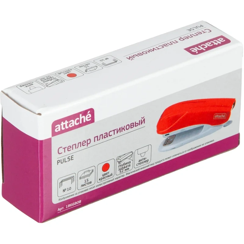 Степлер Attache Pulse предназначен для надежного и качественного скрепления документов в офисе и дома. Компактный размер удобен в использовании и занимает мало места на рабочем столе. Настольный степлер выполнен в пластиковом корпуе красного цвета. Рабочие компоненты изготовлены из высококачественной стали и пластика. Степлер Attache Pulse одновременно сшивает до 15 листов бумаги плотностью до 80 г/кв.м. Степлер скрепляет бумагу закрытым типом сшивания, при котором ножки скобы загибаются внутрь. Это дает возможность надежно хранить сшитые документы на протяжении длительного времени. Степлер совместим со скобами № 10. Глубина закладки бумаги — 52 мм (5.2 см). Размер изделия: 90×25×40 мм. Модель оснащена встроенным антистеплером.