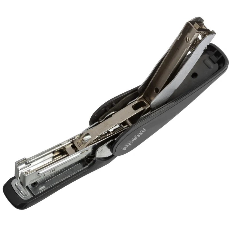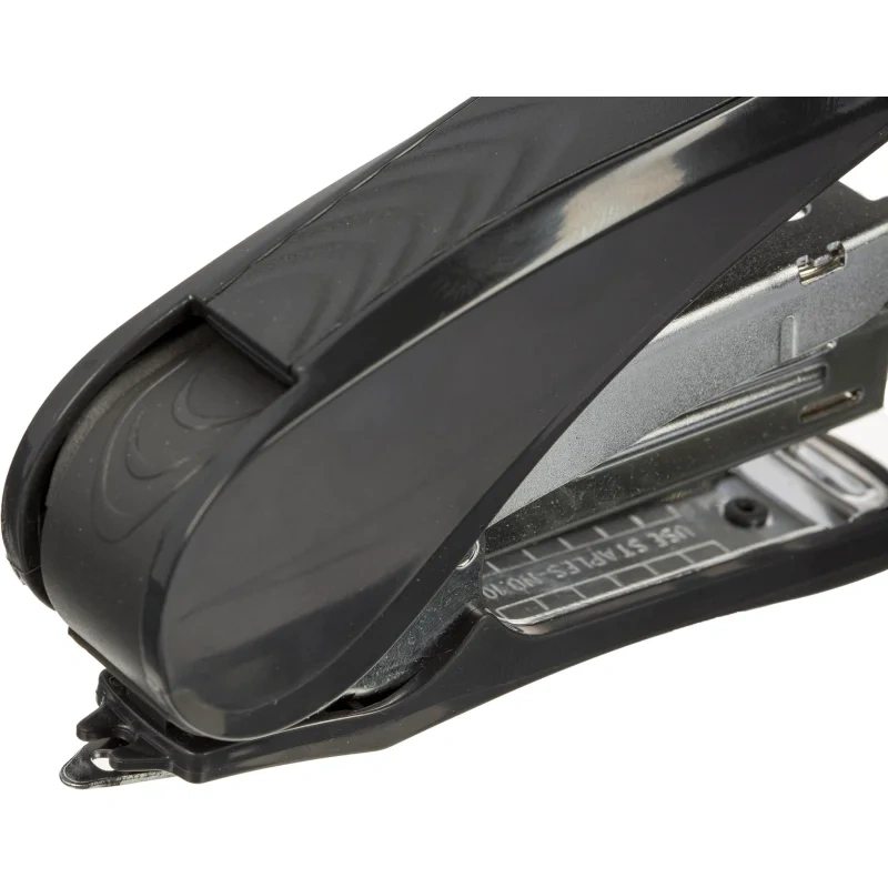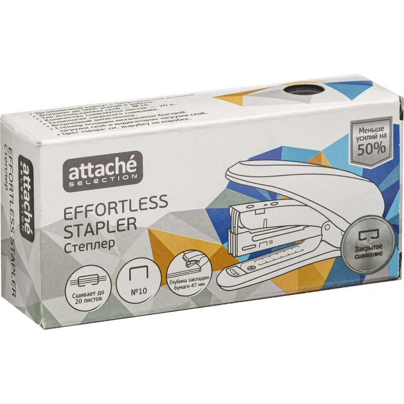 Степлер Attache Selection MSGY1020 (№10) до 20лис,энергосбер,металл,серый Степлер Attache Selection выполнен в металлическом корпусе серого цвета и обладает компактными размерами. Рабочие компоненты изготовлены из высококачественной стали. Детали корпуса выполнены из ударопрочного и износоустойчивого ABS-пластика. Степлер комфортно использовать за счет противоскользящей вставки на верхней части корпуса. Степлер совместим со скобами №10, одновременно сшивая до 20 листов бумаги плотностью до 80 г/кв.м. Благодаря технологии Less Effort при сшивании прилагается до 50% меньше усилий. Модель оснащена антистеплером, механизмом быстрой загрузки скоб и индикатором наполненности лотка для скоб. Степлер скрепляет бумагу закрытым типом сшивания, при котором ножки скобы загибаются внутрь. Это дает возможность надежно хранить сшитые документы на протяжении длительного времени. Вместимость лотка для скоб: 50 скоб размером №10. Глубина закладки бумаги: 47 мм.