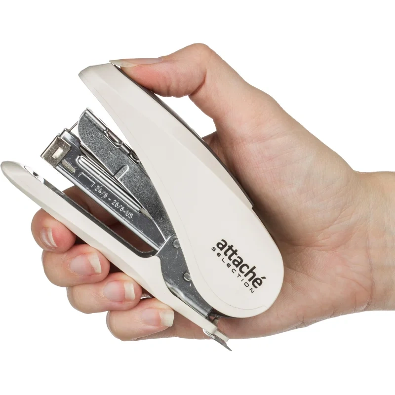 Степлер Attache (Attache Selection) выполнен в металлическом корпусе белого цвета. Рабочие компоненты изготовлены из высококачественной стали. Детали корпуса выполнены из ударопрочного и износоустойчивого ABS-пластика. Степлер комфортно использовать за счет противоскользящей вставки на верхней части корпуса. Степлер совместим со скобами 24/6-26/6, одновременно сшивая до 30 листов бумаги плотностью до 80 г/кв.м. Благодаря технологии Less Effort при сшивании прилагается до 45% меньше усилий. Модель оснащена антистеплером, механизмом быстрой загрузки скоб и индикатором наполненности лотка для скоб. Степлер скрепляет бумагу закрытым типом сшивания, при котором ножки скобы загибаются внутрь. Это дает возможность надёжно хранить сшитые документы на протяжении длительного времени. Вместимость лотка для скоб: 50 скоб размером 24/6 или 100 скоб размером 26/6. Глубина закладки бумаги: 52 мм.