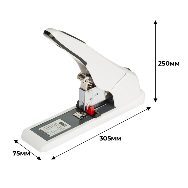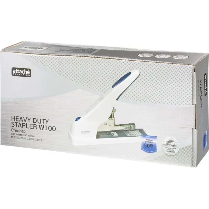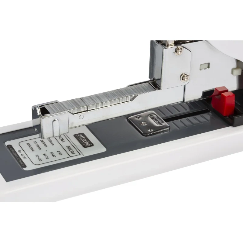 Мощный степлер Attache Selection с максимальной толщиной сшивания бумаги до 100 листов. Регулируемая закладка сшивания: 7–70 мм. Степлер выполнен в современном дизайне с мягкой рукояткой захвата. Степлер имеет усиленную базу для увеличения стабильности сшивания Heavy Duty. Тип и размер используемых скоб — 23/10 (60 листов), N23/13 (до 100л). Загрузка скоб в степлер осуществляется горизонтально. Вместительность скоб 100 шт. Размер изделия: 331?159?83 мм.