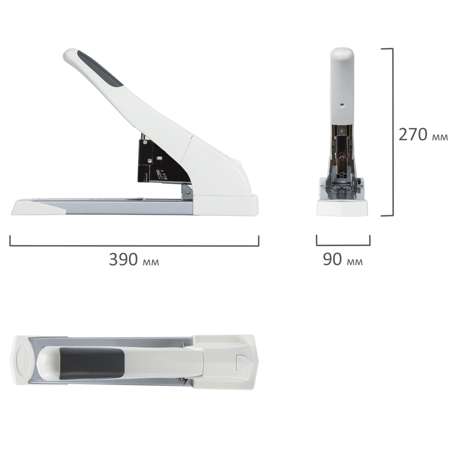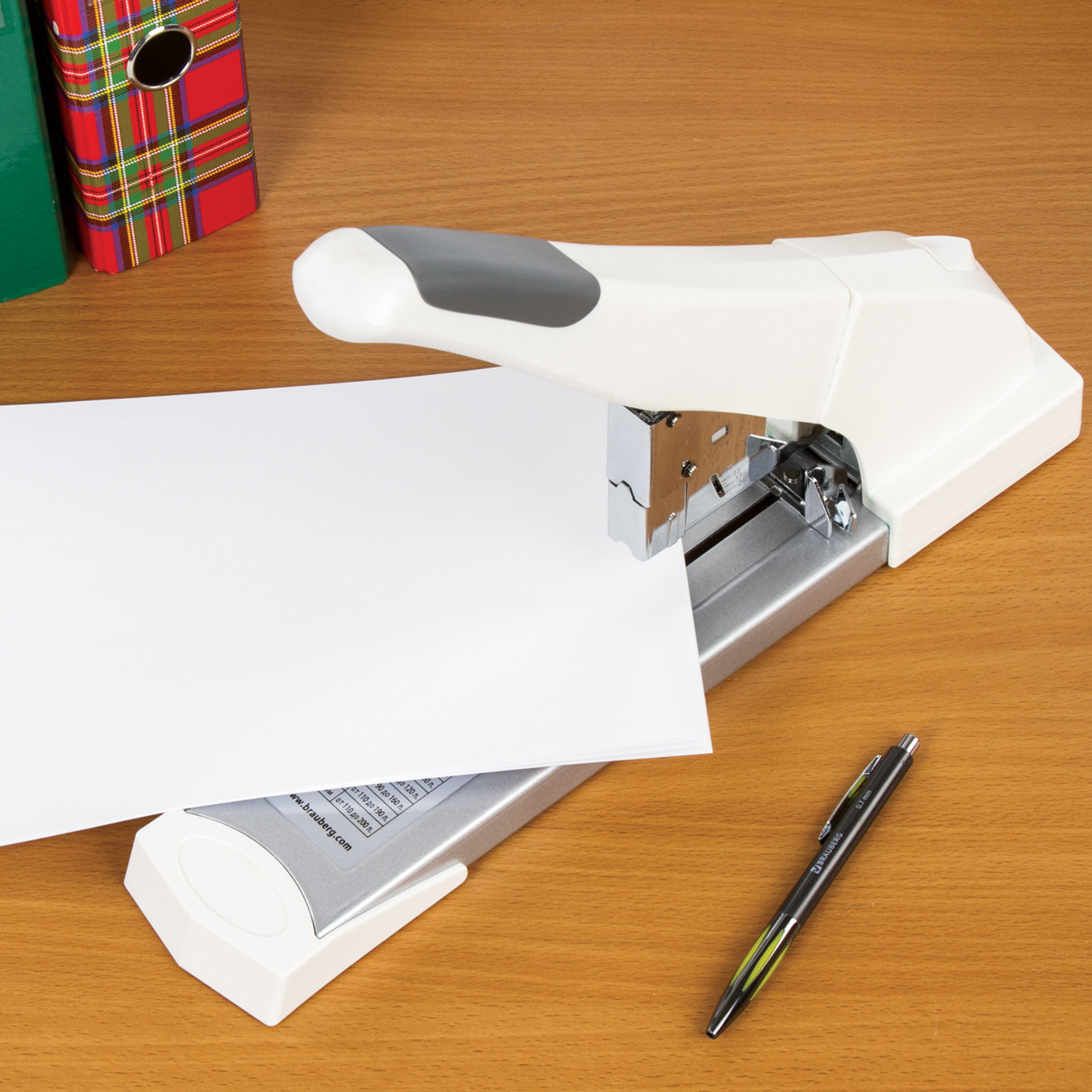 Рабочий механизм выполнен из металла, корпус - из пластика белого цвета. Способен скрепить до 200 листов бумаги. Подходит для скоб № 23/17, № 23/20, № 23/23, № 23/10, № 23/24, № 23/13, № 23/15. Глубина закладки бумаги регулируется - до 64 мм. Закрытый вид сшивания. Фронтальная загрузка скоб.