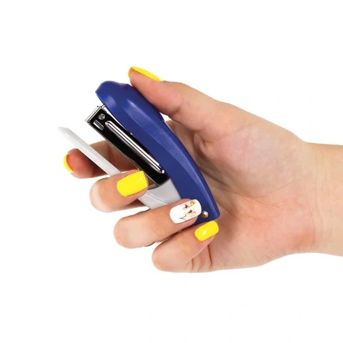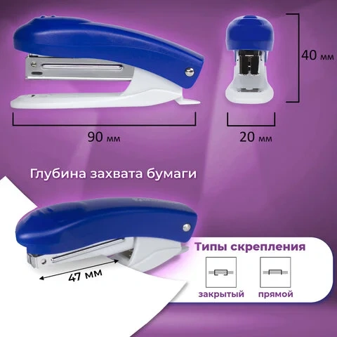 Габариты: высота - 40 мм, ширина - 20 мм, длина - 90 мм. Благодаря компактным размерам, степлер удобен в использовании и занимает мало места на рабочем столе. Классический дизайн делает его подходящим к любому интерьеру.