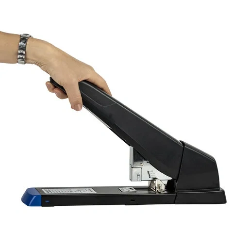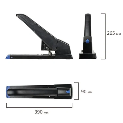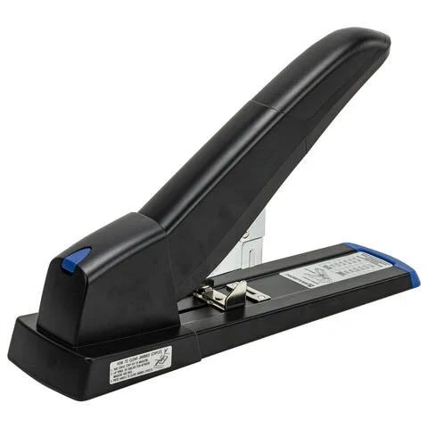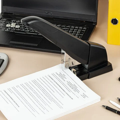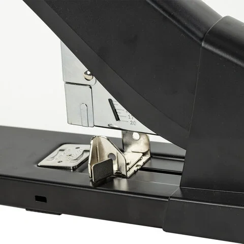 Рабочий механизм выполнен из металла, корпус - из металла и пластика черного цвета. Способен скрепить до 210 листов бумаги. Подходит для скоб № 24/6, № 26/6, № 23/8, № 24/8, № 23/10, № 23/13, № 23/15, № 23/17, № 23/20, № 23/23, № 23/24. Глубина закладки бумаги регулируется - до 65 мм. Закрытый вид сшивания. Фронтальная загрузка скоб.