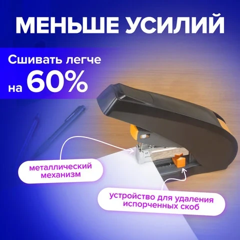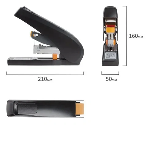 Рабочий механизм выполнен из металла, корпус — из пластика черного цвета. Способен скрепить до 100 листов бумаги. Подходит для скоб № 24/6, 26/6, № 23/8, 24/8, № 23/10, № 23/13. Глубина закладки бумаги регулируется - до 50 мм. Закрытый вид сшивания. Оснащен устройством для удаления испорченных скоб.