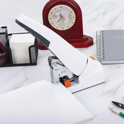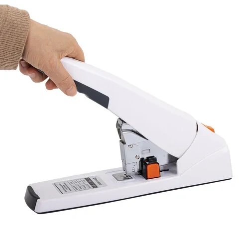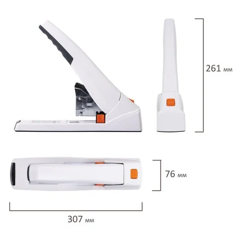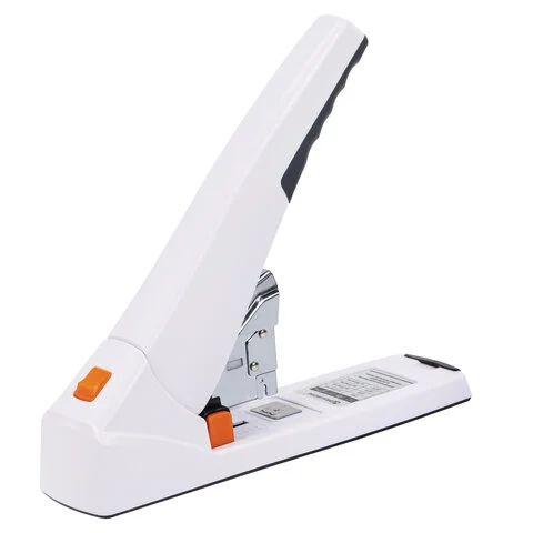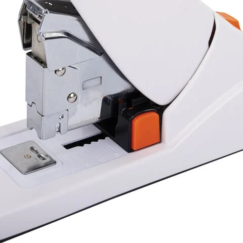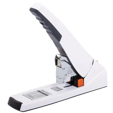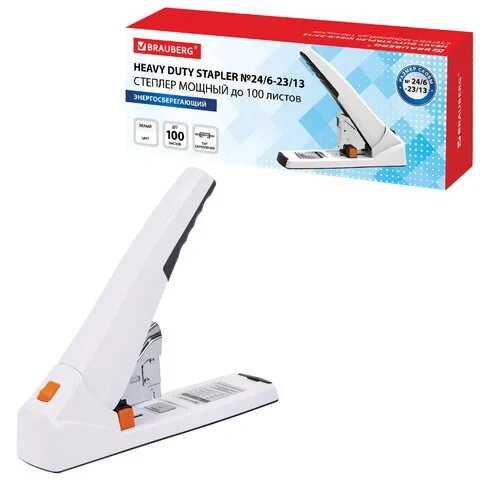 Рабочий механизм выполнен из металла, корпус — из пластика белого цвета. Способен скрепить до 100 листов бумаги. Подходит для скоб № 24/6 - № 23/13. Глубина закладки бумаги регулируется - до 50 мм. Закрытый вид сшивания.