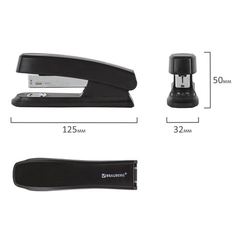 Настольный степлер BRAUBERG 'Standard' в черном пластиковом корпусе с металлическим механизмом cпособен скрепить до 25 листов. Подходящий размер скоб № 24/6, 26/6. Виды сшивания: закрытый, открытый, прямой. Глубина закладки бумаги - 60 мм. Габариты: высота - 50 мм, ширина - 32 мм, длина - 125 мм. Благодаря компактным размерам удобен в использовании и занимает мало места на рабочем столе, а классический дизайн делает степлер подходящим к любому интерьеру. Продается в картонной упаковке.