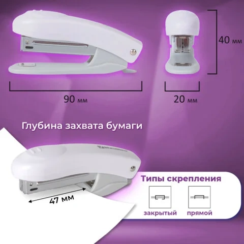 Способен скрепить до 12 листов. Стандартный размер скоб №10. Глубина закладки бумаги - 47 мм. Данная модель может выступать в качестве антистеплера, позволяющего разжать закрепленные скобы более качественно, не нанося повреждений ни материалу, ни кончикам пальцев. Корпус изготовлен из пластика. За счет компактных размеров не займет на рабочем столе много места, а классический белый цвет отлично будет дополнять любой интерьер.