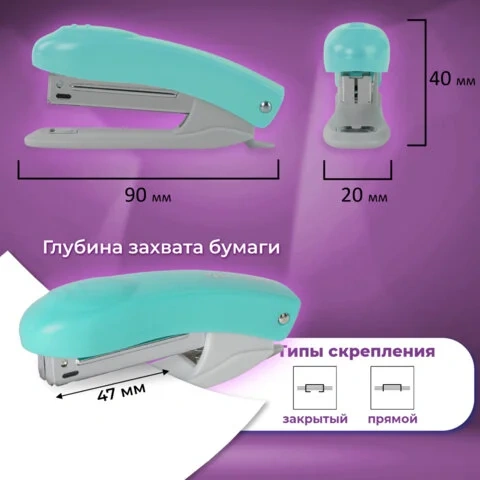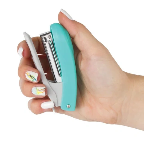 Данная модель может выступать в качестве антистеплера, позволяющего разжать закрепленные скобы более качественно, не нанося повреждений ни материалу, ни кончикам пальцев. За счет миниатюрных размеров степлер не займет много места на рабочем столе, а яркое бирюзово-серое сочетание станет отличным акцентом в интерьере.