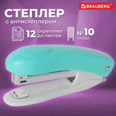 Степлер Brauberg Original №10, до 12 листов, с антистеплером, бирюзовый