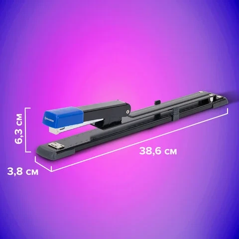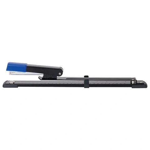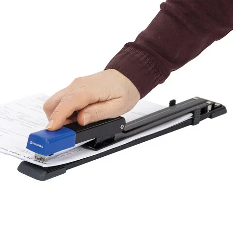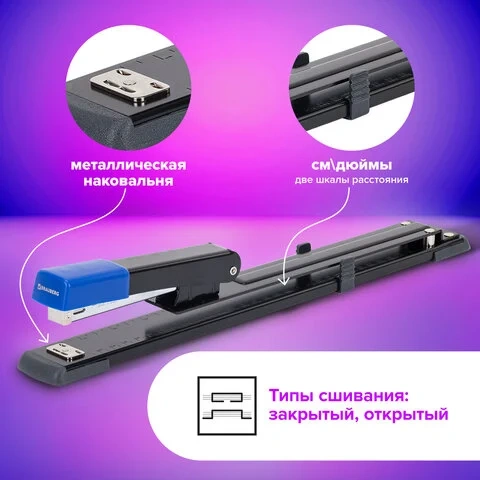 Металлический механизм позволяет сшивать открытым и закрытым способами документы объемом до 30 листов и регулировать глубину закладки бумаги до 30 см. Вмещает 150 скоб № 24/6. Регулятор расстояния сшивания имеет двойную градацию шкалы (сантиметр, дюйм). Корпус выполнен из металла и пластика.