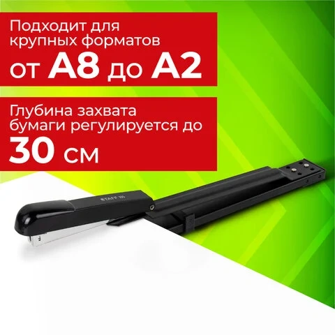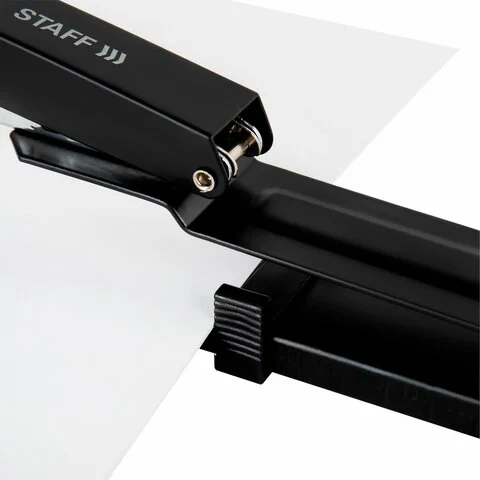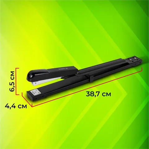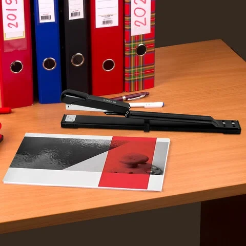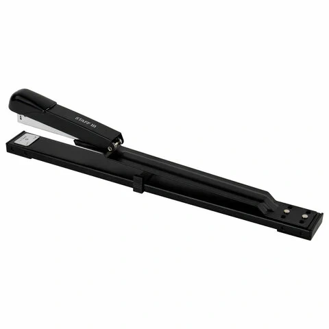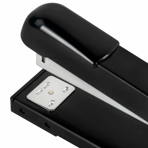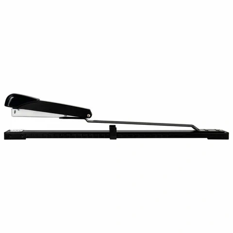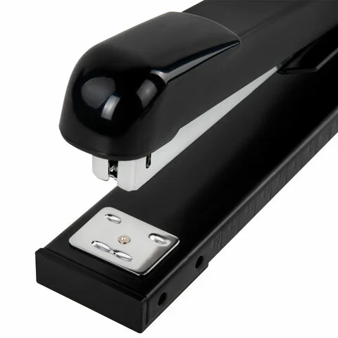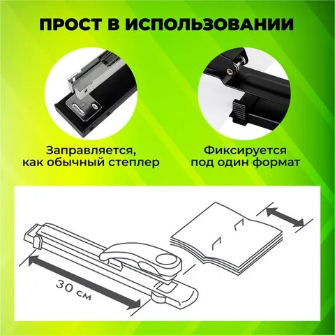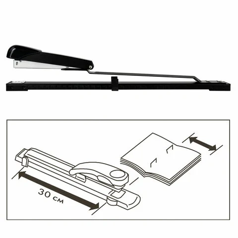 Металлический механизм позволяет сшивать открытым и закрытым способами документы объемом до 25 листов и регулировать глубину закладки бумаги до 30 см. Вмещает 100 скоб № 24/6. Корпус выполнен из металла и пластика.