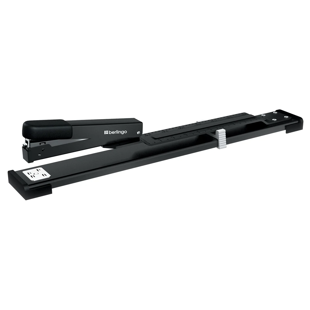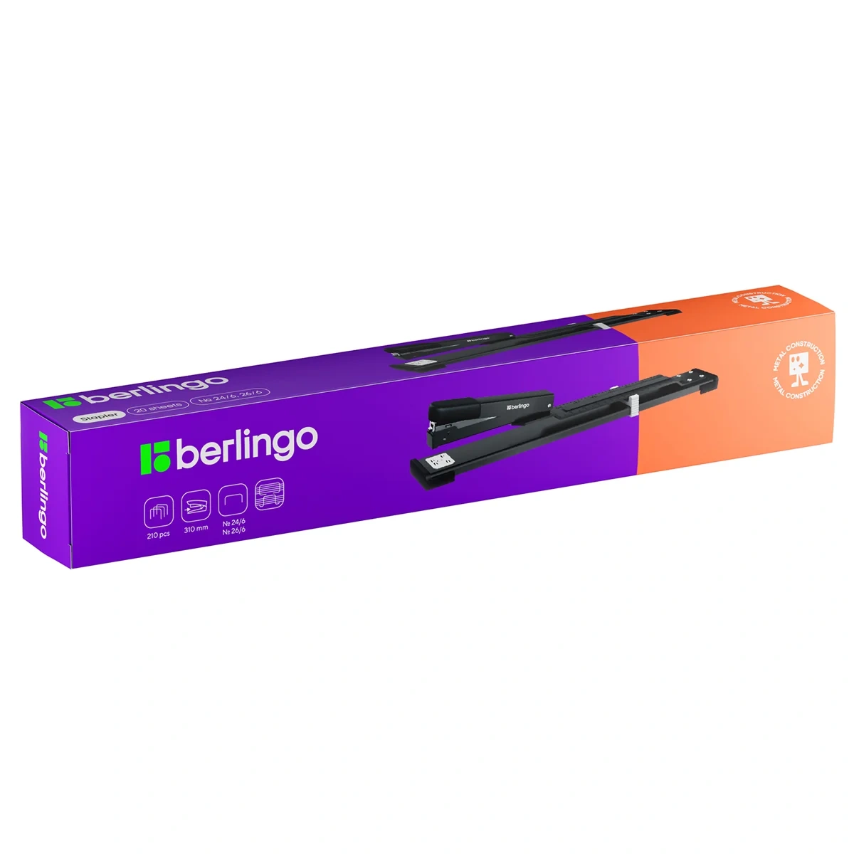Брошюровочный степлер Berlingo идеально подходит для скрепления крупноформатных документов. Степлер вмещает 210 скоб размером №24/6, 26/6 и имеет 2 типа скрепления. Сшивает до 20 листов. Глубина захвата – 310 мм.