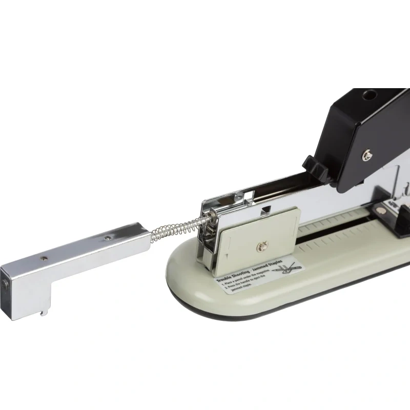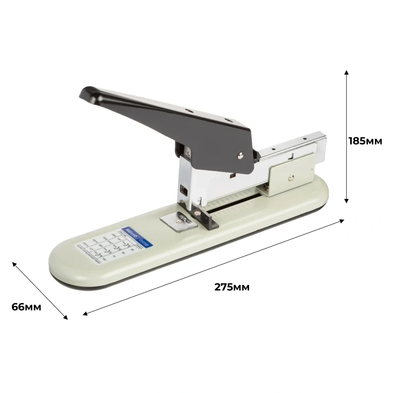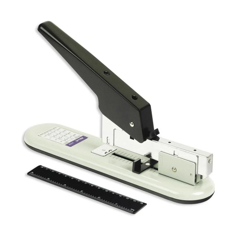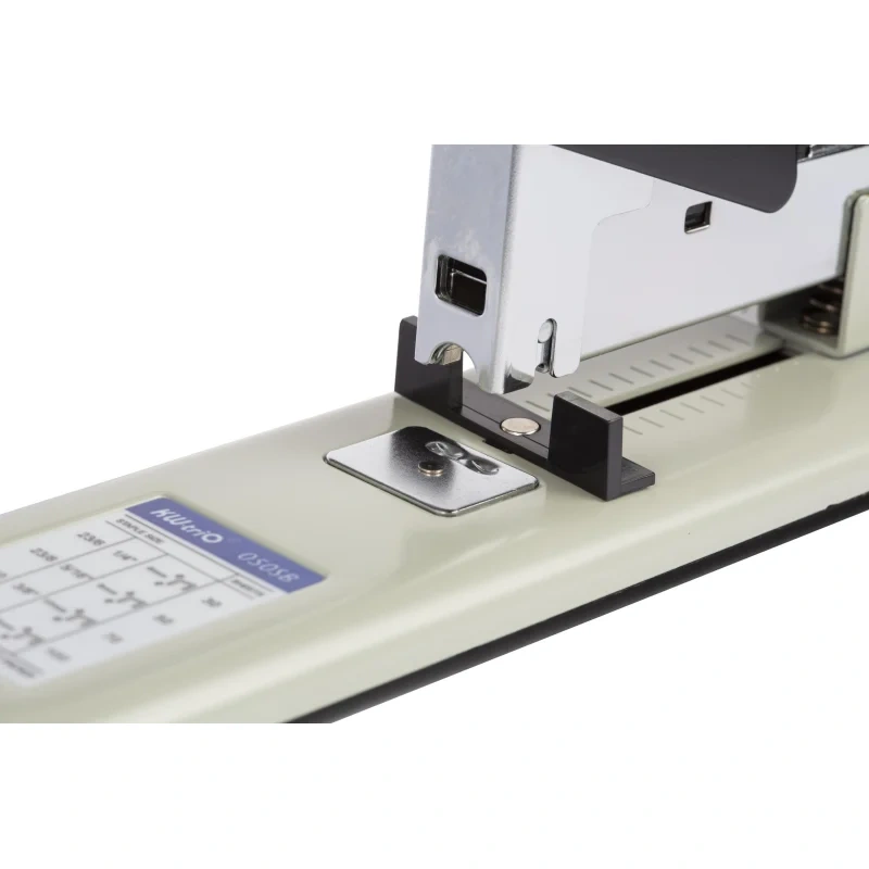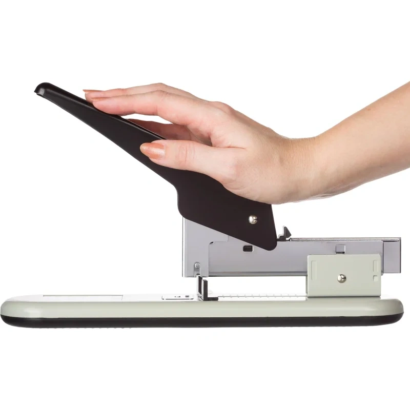 Для эффективного сшивания максимально допустимого объема бумаги необходимо расположить степлер на горизонтальной твердой поверхности, прикладывая усилия, плавно надавить на рычаг (при необходимости двумя руками), разномерно распределяя усилия по поверхности рычага.
