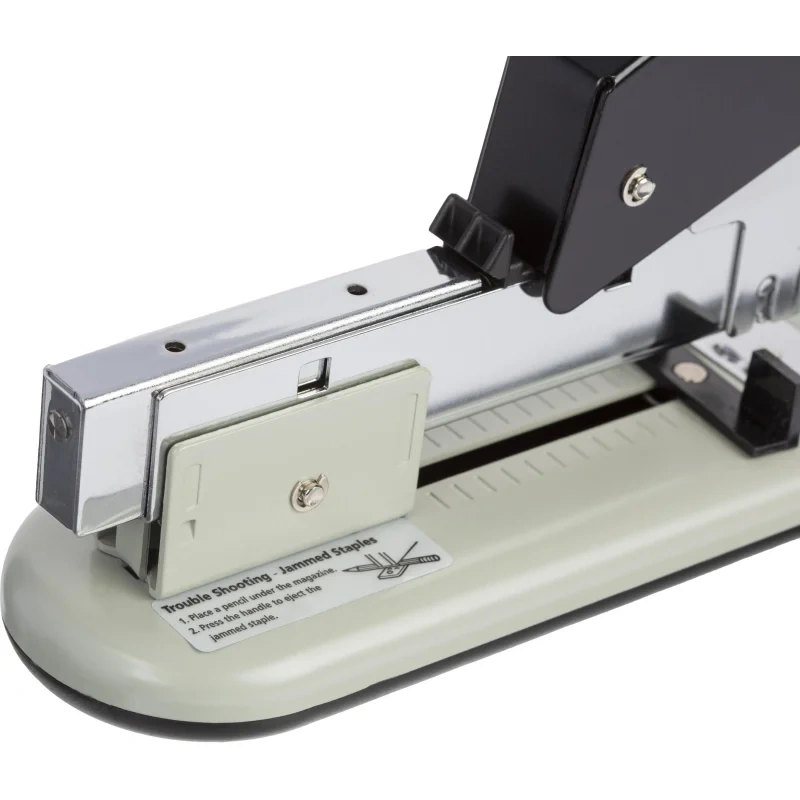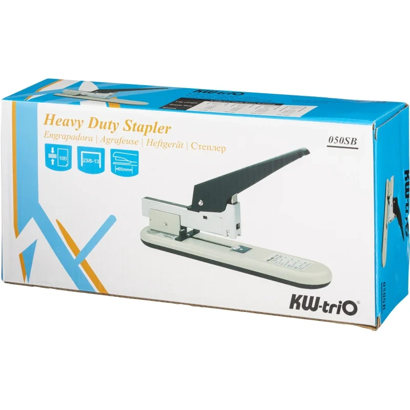 Мощный степлер KW-Trio с максимальной толщиной сшивания бумаги до 100 листов. Глубина закладки листов регулируется от 7 до 65 мм. Пластиковая основа степлера не царапает поверхность стола и предотвращает скольжение. Загрузка скоб в степлер осуществляется фронтально. Тип и размер используемых скоб: N23/6, 23/8, 23/10, 23/13.
