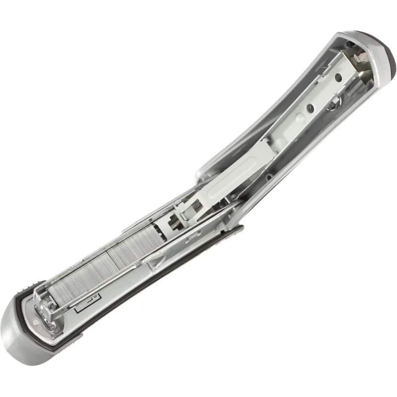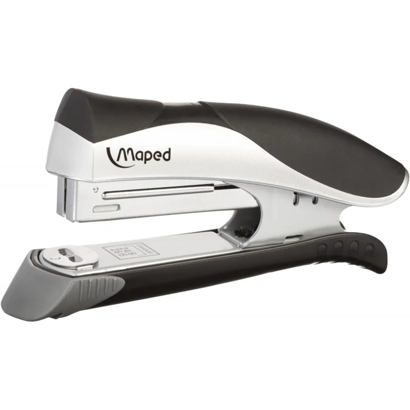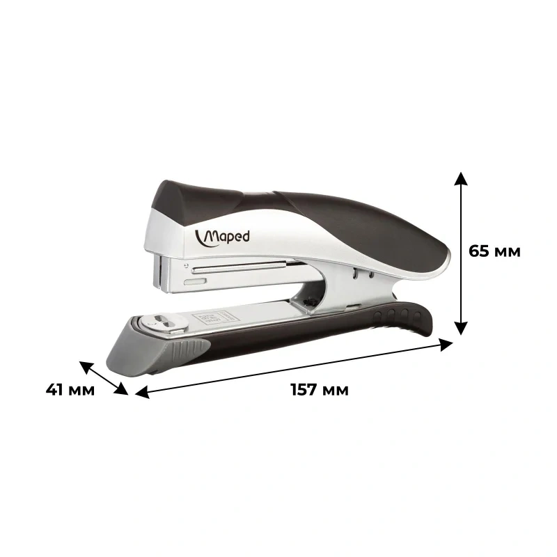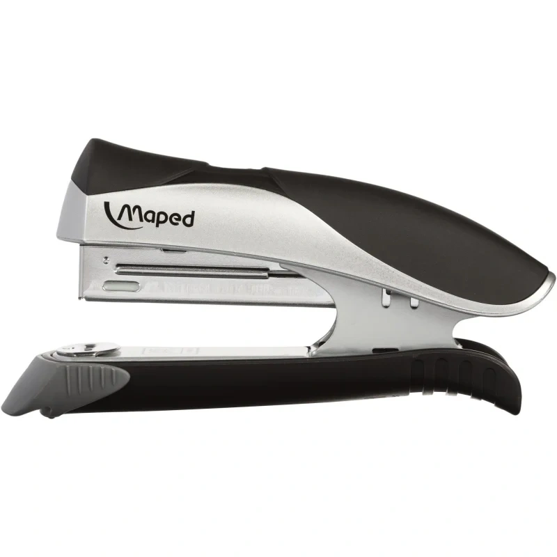 Эргономичный настольный степлер средний Maped Ergologic одновременно сшивает до 25 листов: плотность бумаги 80 гр/м.кв - 20 листов, плотность бумаги 70 гр/м.кв - 25 листов. Адаптирован к геометрии руки. Мягкие материалы в зоне давления. Удобное отделение для запасных скоб + скобы в комплекте (в отделении для запасных скоб). Механизм защиты от застревания скоб. Позволяет производить сшивание закрытым способом. Максимальная глубина закладки бумаги составляет 60 мм (6 см). Металлический толкатель. Гарантия 10 лет. Корпус выполнен из пластика черного цвета. В степлере используются скобы 24/6, 26/6. Вместимость скоб: 100 шт 24/6 или 130 шт 26/6. Размер изделия: ДхШхВ 157x41x65 мм. Для эффективного сшивания максимально допустимого объема бумаги необходимо расположить степлер на горизонтальной твердой поверхности, прикладывая усилия, плавно надавить на рычаг (при необходимости двумя руками), разномерно распределяя усилия по поверхности рычага.