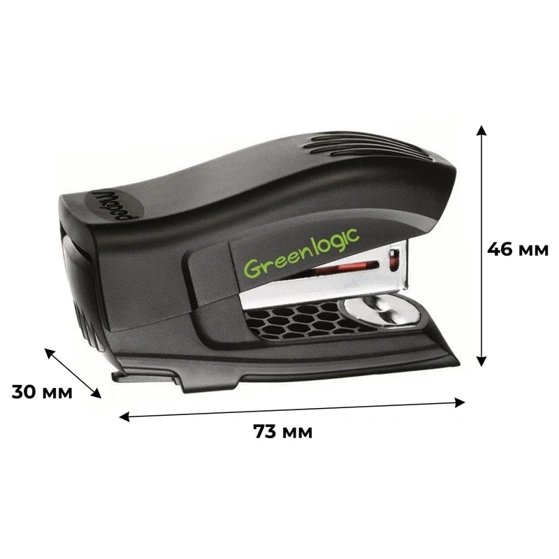 Экологичный мини степлер Maped Greenlogic 'Эко' одновременно сшивает до 15 листов: плотность бумаги 80 г/м. кв - 12 листов, плотность бумаги 70 г/м. кв - 15 листов. Маленький степлер позволяет производить сшивание закрытым способом. Степлер незаменим при работе в офисе или дома с документами. Максимальная глубина закладки бумаги составляет 28 мм (2,8 см). Оснащен встроенным антистеплером. Корпус черного цвета. В степлере используются скобы 24/6 (вместимость 41 шт. ) или 26/6 (вместимость 58 шт. ). Облегченный корпус. Хранится в горизонтальном и вертикальном положении. Индикатор остатка скоб. Гарантия 3 года. Размер изделия: ДхШхВ 46x73x30 мм. Степлер является очень компактным и удобным, не занимая много места на рабочем столе. Материал корпуса состоит на 95% из переработанного пластика.