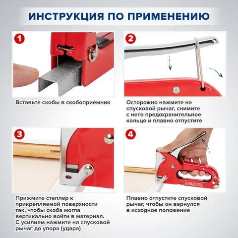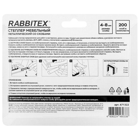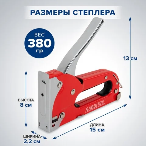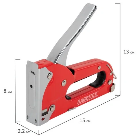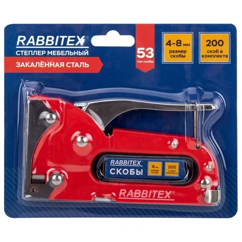 Степлер мебельный стальной, тип скобы 53, высота скоб 4-8 мм, 200 скоб 8 мм в комплекте, RABBITEX, 6