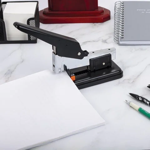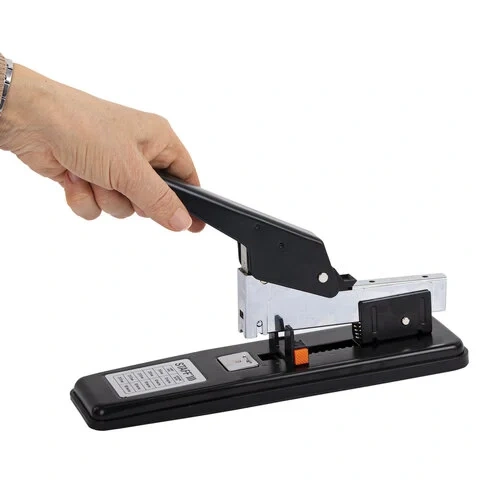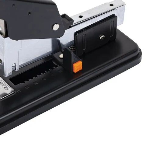 Рабочий механизм и корпус выполнены из металла. Способен скрепить до 100 листов бумаги. Подходит для скоб № 24/6 - 23/15. Глубина закладки бумаги регулируется до 66 мм. Закрытый тип сшивания.