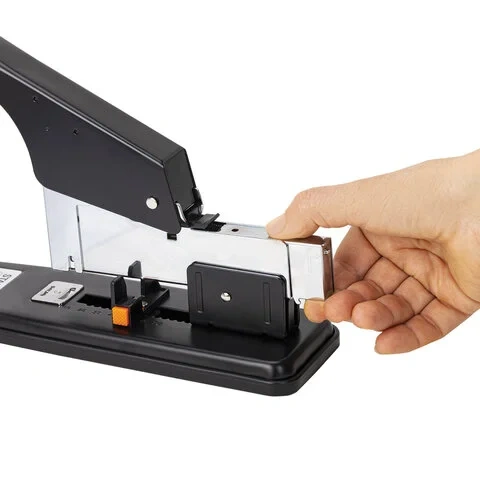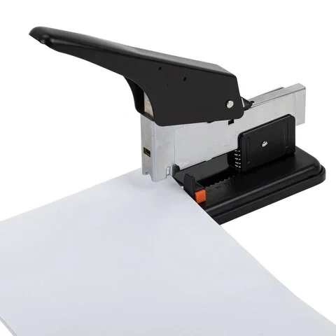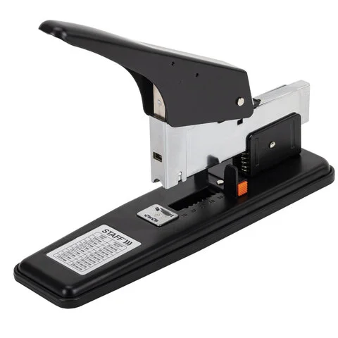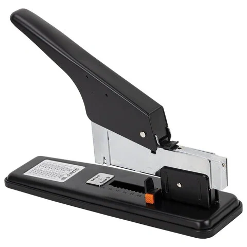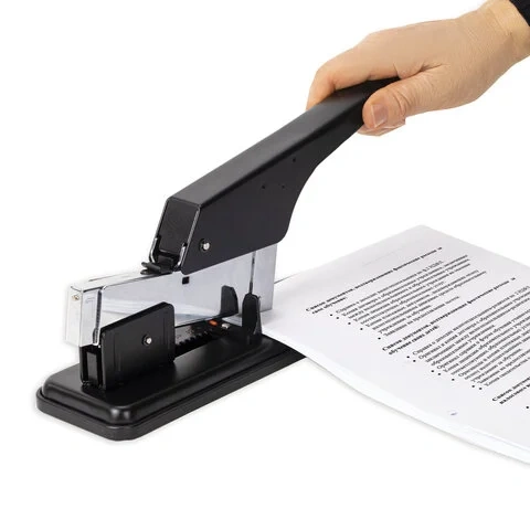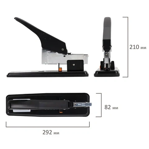 Рабочий механизм и корпус выполнены из металла. Способен скрепить до 200 листов бумаги. Подходит для скоб № 24/6, 26/6, № 23/15, № 23/17, № 23/20, № 23/8, 24/8, № 23/23, № 23/10, № 23/24, № 23/13. Глубина закладки бумаги регулируется до 66 мм. Закрытый и открытый виды сшивания.