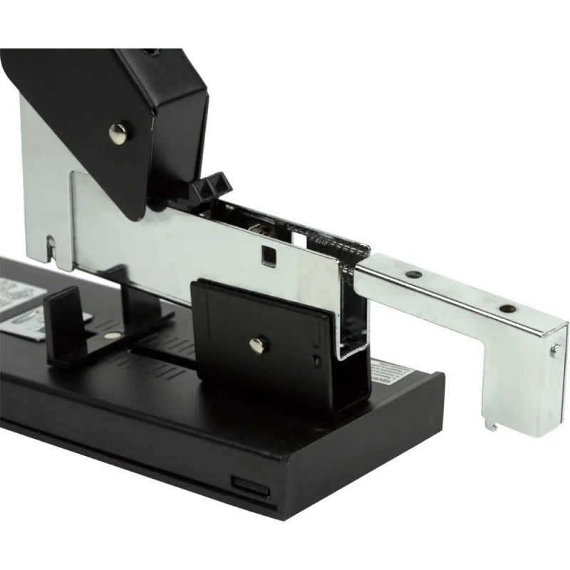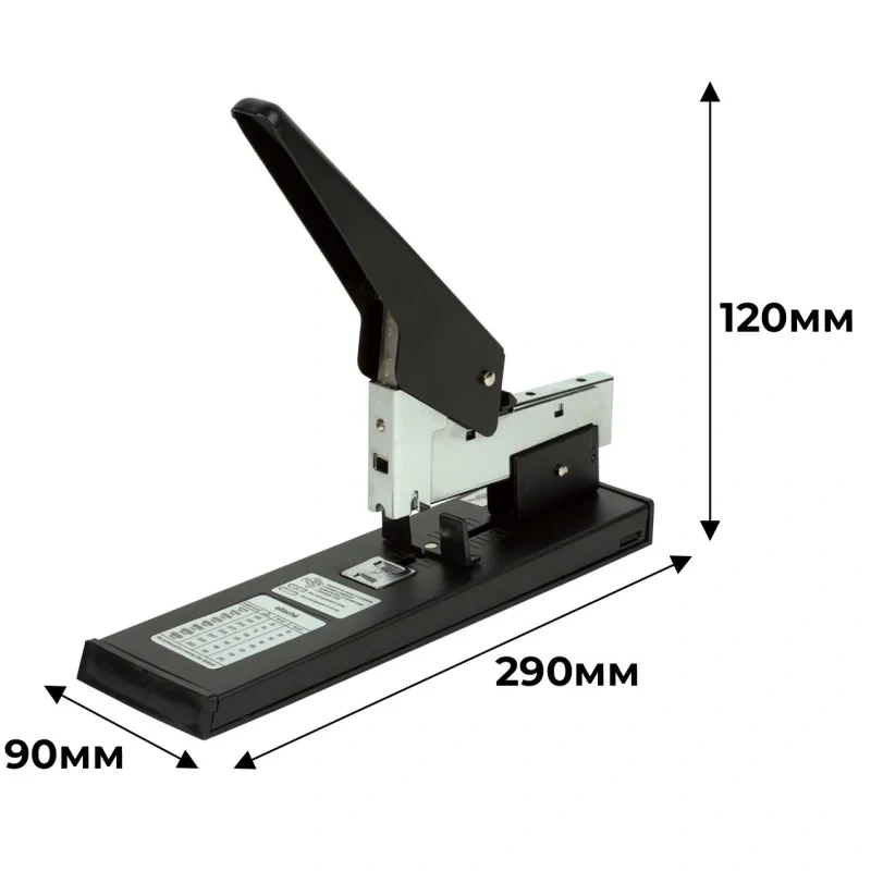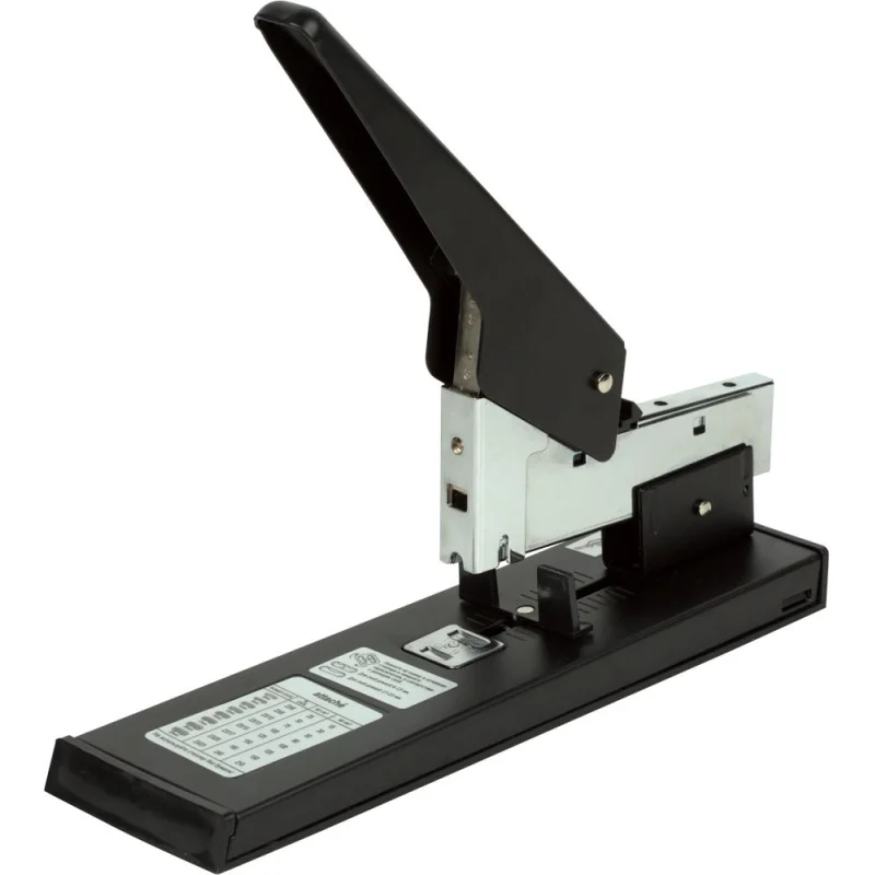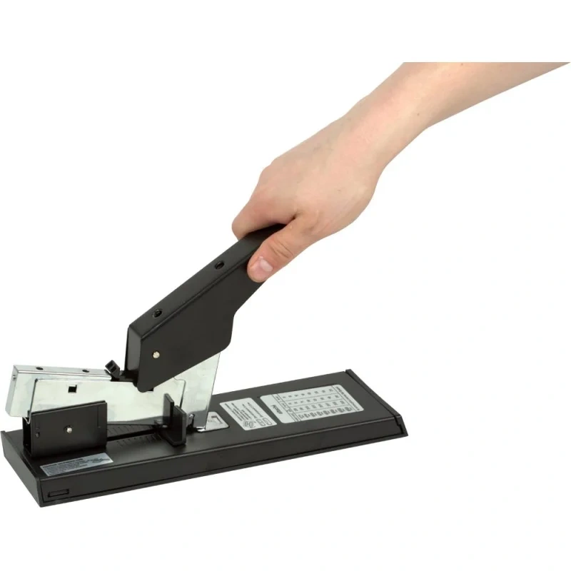 Мощный степлер с максимальной толщиной сшивания бумаги до 210 листов незаменим при работе с большим объёмом документов. Глубина закладки листов регулируется от 6 до 65 мм. Пластиковая основа степлера не царапает поверхность стола и предотвращает скольжение. Тип и размер используемых скоб: N23/6, 23/8, 23/10, 23/13, 23/15, 23/17, 23/20, 23/23. Загрузка скоб в степлер осуществляется фронтально. Вместимость контейнера: 100 штук. Инструкция по удалению застрявших скоб: 1. Извлеките оставшиеся скобы из контейнера. 2. Установите карандаш между ручкой степлера и основанием за местом выхода скоб. 3. Надавите на рычаг степлера для удаления застрявшей скобы. Для эффективного сшивания максимально допустимого объёма бумаги необходимо расположить степлер на горизонтальной твёрдой поверхности, прикладывая усилия, плавно надавить на рычаг (при необходимости двумя руками), разномерно распределяя усилия по поверхности рычага.
